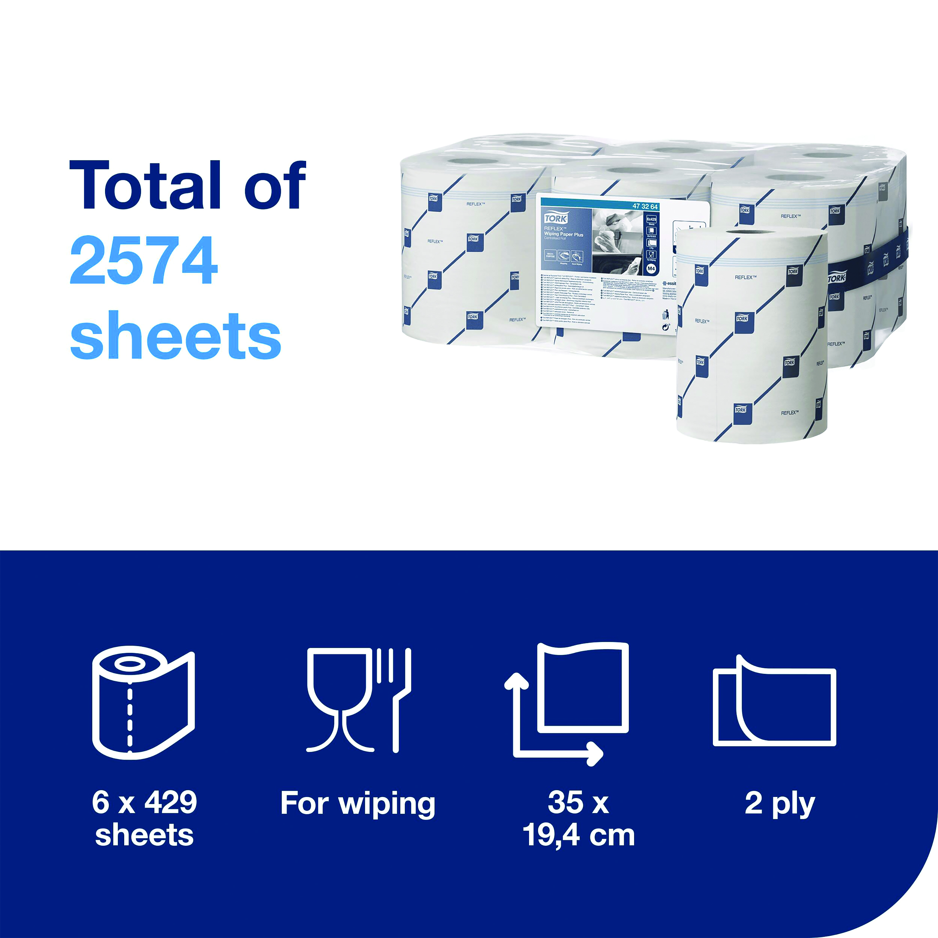 This two-ply Tork Reflex wiping paper plus is designed to take on any task that requires strength and absorbency whether it is quickly drying hands or mopping up liquids. For use with Tork's single sheet centrefeed dispenser systems to reduce consumption by 37%, saving money on industrial paper rolls. The absorbent, two-ply white paper comes on 150.2m rolls, with 429 sheets per roll. This pack contains 6 rolls.